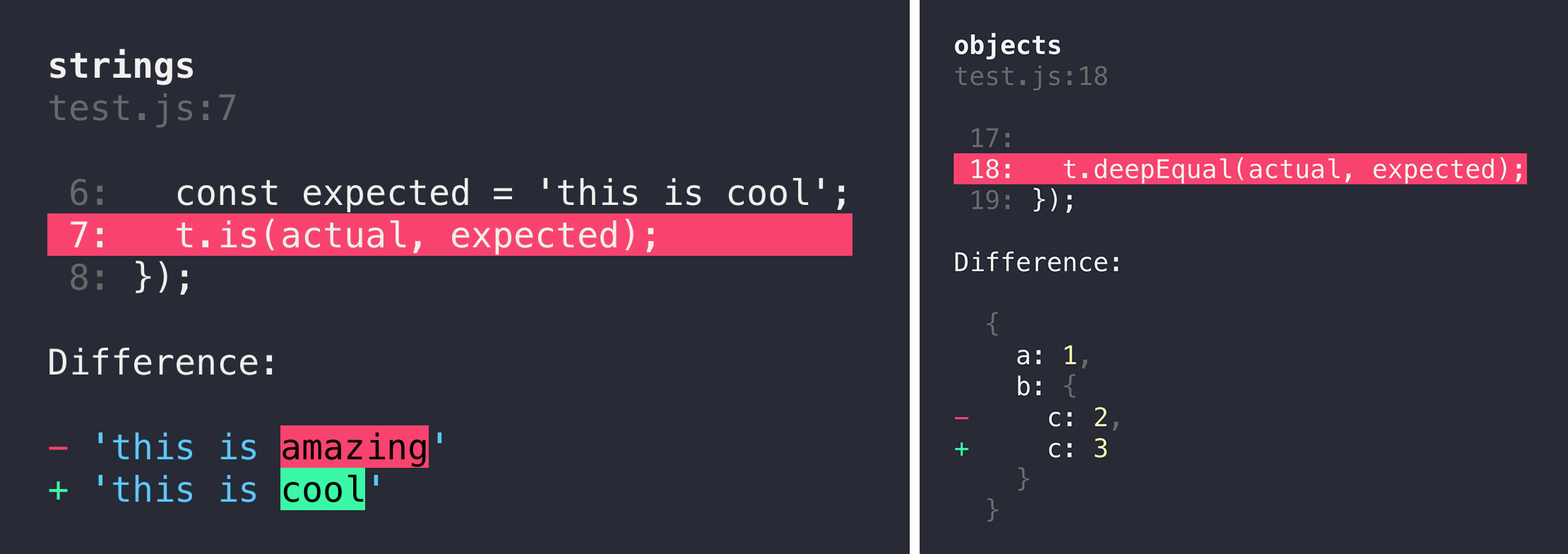 AVA adds code excerpts and clean diffs for actual and expected values. If values in the assertion are objects or arrays, only a diff is displayed, to remove the noise and focus on the problem. The diff is syntax-highlighted too! If you are comparing strings, both single and multi line, AVA displays a different kind of output, highlighting the added or missing characters.