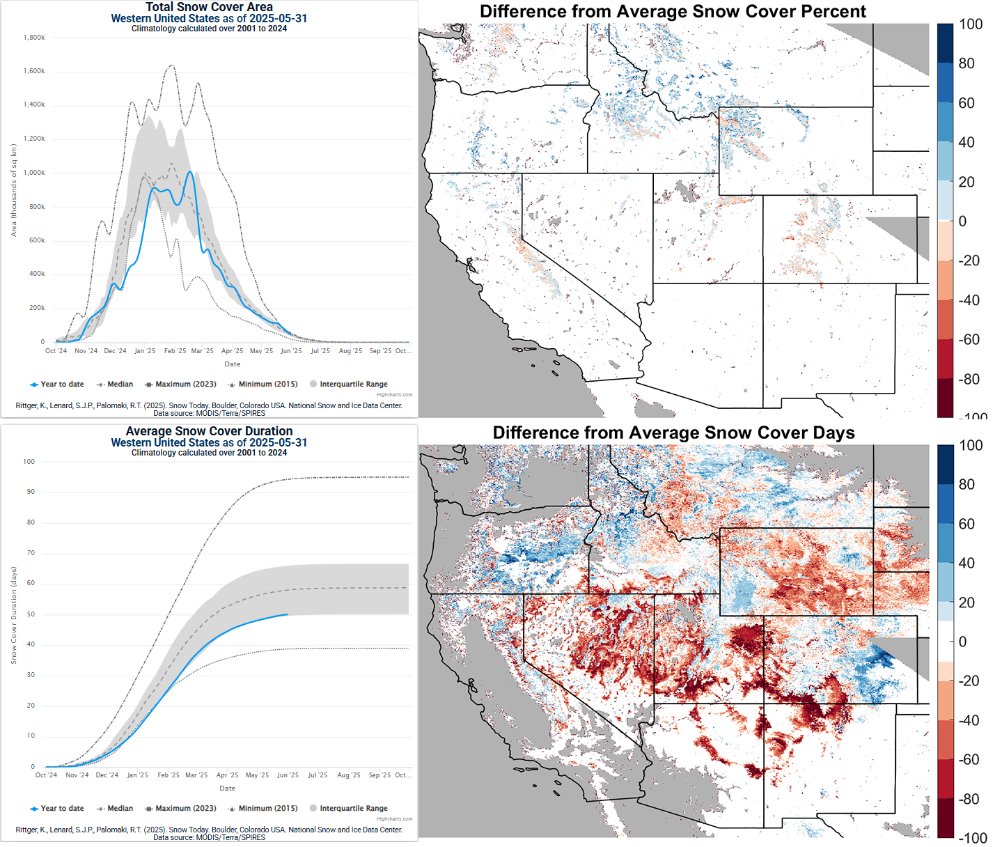 Snow cover duration measured in days summed from October 1 to May 31 continued to increase (Figure 2, lower left). Similar to April, snow cover duration during May remained near the twenty-fifth percentile. In Nevada, Utah, Arizona, and New Mexico, snow cover duration was up to 100 days below average in large areas (Figure 2, lower right). Most of Wyoming also had 20 to 40 fewer snow-covered days than average. The remaining western states showed a mix of below and above average snow-covered days, with Colorado in particular showing well below average conditions in the southern part of the state and well above average snow-covered days in the eastern plains.