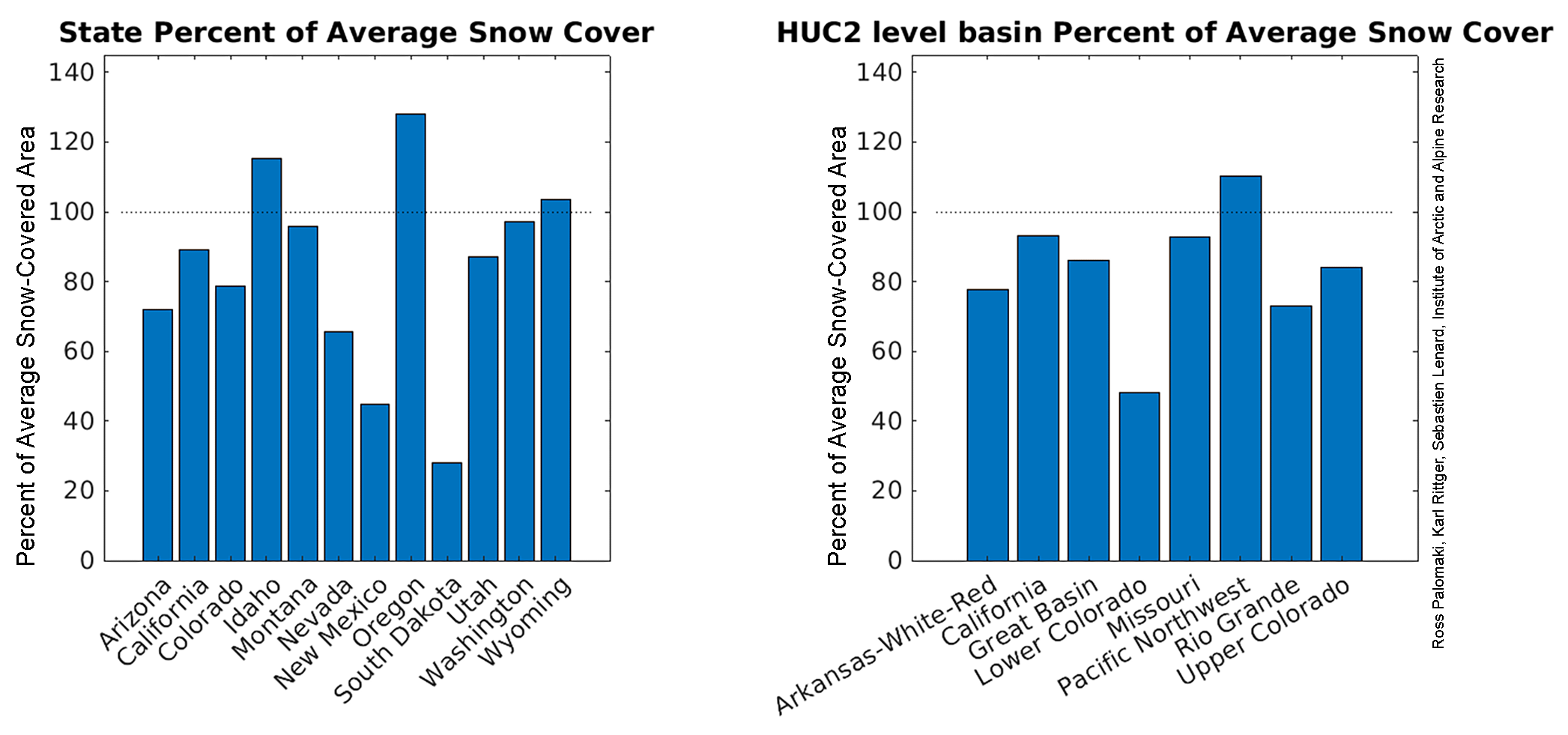 Figure 1. The left bar graph shows the percent-of-average snow-covered area in April 2025 in the western United States, while the graph on the right depicts the percent-of-average snow-covered area in hydrologic unit code 2 (HUC2) basins for the same month. — Credit: Ross Palomaki, Karl Rittger, Sebastien Lenard, Institute of Arctic and Alpine Research